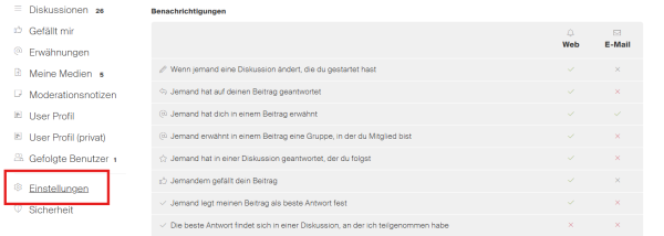 Dort kannst du festlegen, ob du Benachrichtigungen direkt auf der Plattform (Web) oder per E-Mail erhalten möchtest – zum Beispiel wenn jemand auf deinen Beitrag antwortet oder dich erwähnt.