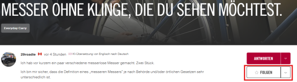 Wenn du eine bestimmte Diskussion weiterverfolgen möchtest, öffne das entsprechende Thema und klicke oben rechts auf „Folgen“.