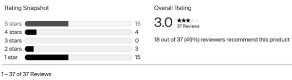 Insgesamt haben 37 Personen das Produkt bewertet. 15 haben eine 5 Sterne Bewertung abgegeben, 15 eine 1 Sterne Bewertung. Der Schnitt ist genau in der Mitte, 3.0. Wenn man die Reviews liest merkt man gut, dass die 1 Sterne Bewerter meistens den Preis oder die Funktionalität bewerteten, und die 5 Sterne Bewerter das Design. Das sind in meinen Augen komplett unterschiedliche Kategorien. Entsprechend ist es für Kunden schwierig, eine Übersicht zu haben. Wenn einem das Geld keine Rolle spielt, muss der Punkt «Preis» nicht berücksichtigt werden; wem der Punkt Funktionalität wichtig ist, dem spielt das «Design» kaum eine Rolle, etc. Deshalb schlage ich folgende Kategorien für eine Bewertung vor, anhand dieser dann ein Schnitt für ein Produkt errechnet werden kann. Es sind es die Kategorien: